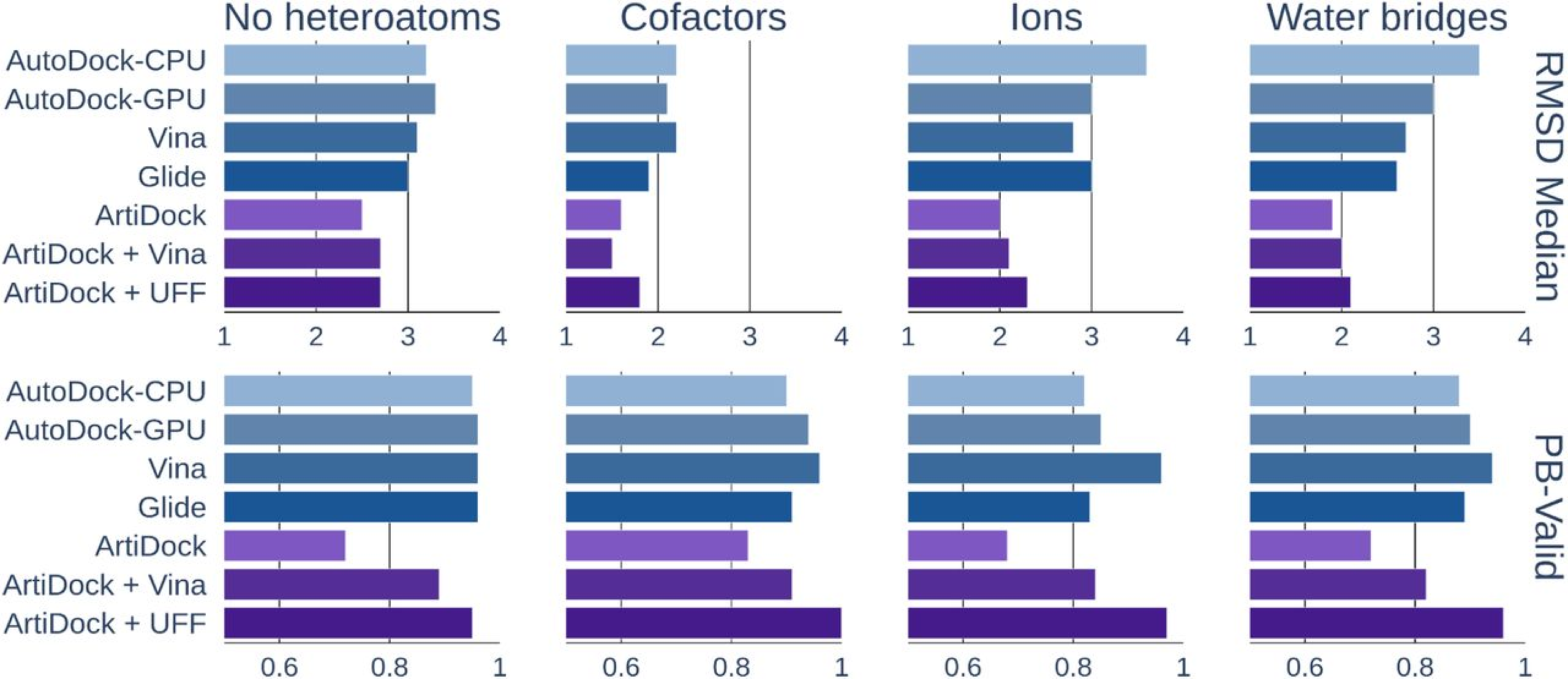 Figure 2. ArtiDock performance in pockets containing no heteroatoms, cofactors, ions, or bound water: median RMSD (root-mean-square deviation, in Å) and PB-Valid (fraction of poses passing PoseBusters quality checks). [Credit: Receptor.AI]